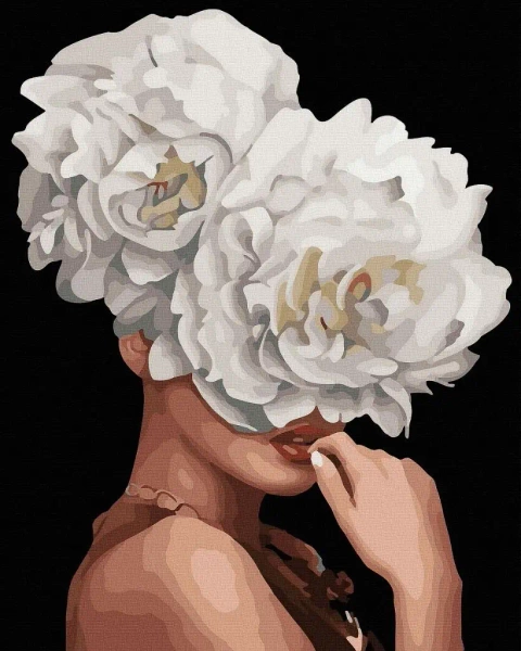 Elegancka sylwetka kobiety z ogromnym bukietem białych kwiatów zakrywających twarz. Subtelność, klasa i odrobina tajemnicy.
