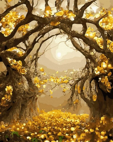 Odkryj magiczną ścieżkę otoczoną starymi, rozłożystymi drzewami z liśćmi w złotych barwach jesieni. Ten obraz przeniesie Cię w świat ciszy, spokoju i bajkowej natury.