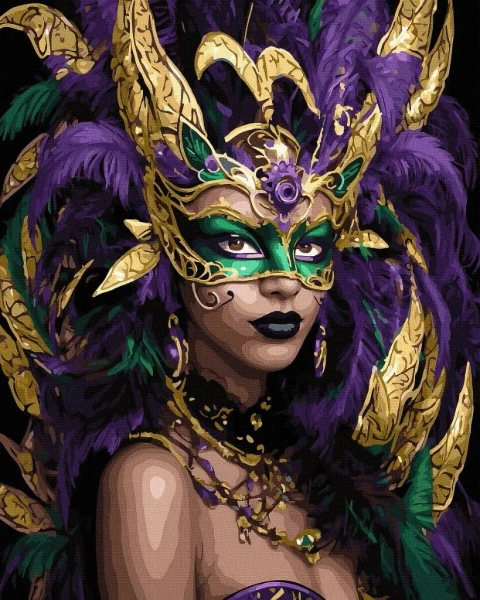 Bogato zdobiona kobieta w masce karnawałowej z piórami w odcieniach fioletu, zieleni i złota. Ten obraz pełen jest energii i tajemniczości prawdziwa uczta dla oczu!
