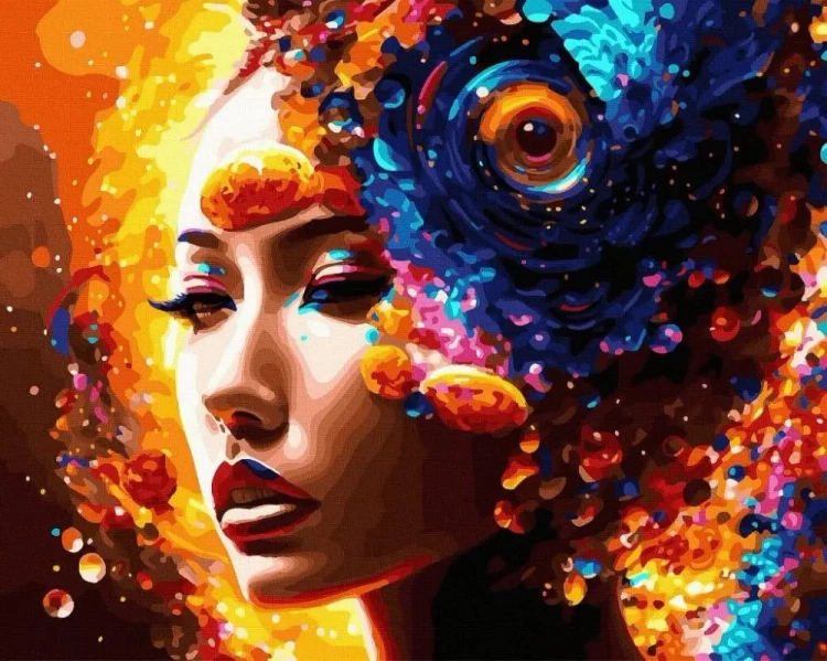 Portret kobiety z kosmicznym wzorem we włosach i oczach pełnych głębi. Obraz emanuje tajemniczością i energią wszechświata. Doskonały wybór dla fanów sztuki nowoczesnej i galaktycznych klimatów.