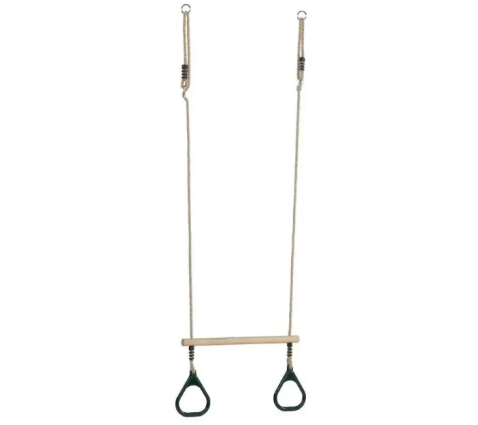 Trapez z uchwytami łączy w sobie dwa fajne produkty. Pozwala Twoim dzieciom zwisać, trzymając się za uchwyty lub huśtać się na drążku. Zarówno drążek, jak i uchwyty są mocne i łatwe w uchwyceniu. Linki są miękkie w dotyku oraz odporne na wodę i czynniki pogodowe.