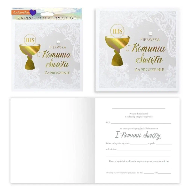 Zaproszenie Premium na I Komunię Świętą ZP-055 Zaproszenia z serii Premium ZP wyróżniają się elegancją i wyjątkowym opakowaniem. Zdobienia w zależności od wzoru zawierają dekoracyjne elementy doklejane - perełki, kokardki, akcenty biżuteryjne; tłoczenia oraz uszlachetnienia, takie jak folia perłowa lub holograficzna. Zaproszenia pakowane są po 5 sztuk, mają w zestawie dopasowane koperty, a na specjalnej wkładce z tyłu można przeczytać tekst zaproszenia. Cechy szczególne: typ produktu: zaproszenie na Komunię zdobienia: doklejane elementy dekoracyjne, tłoczenie przestrzenne, uszlachetnienia z folii perłowej lub holograficznej orientacyjna wielkość: 14,5 x 14,5 cm w opakowaniu: 5 sztuk zaproszeń z dopasowanymi kopertami, okazja: Komunia