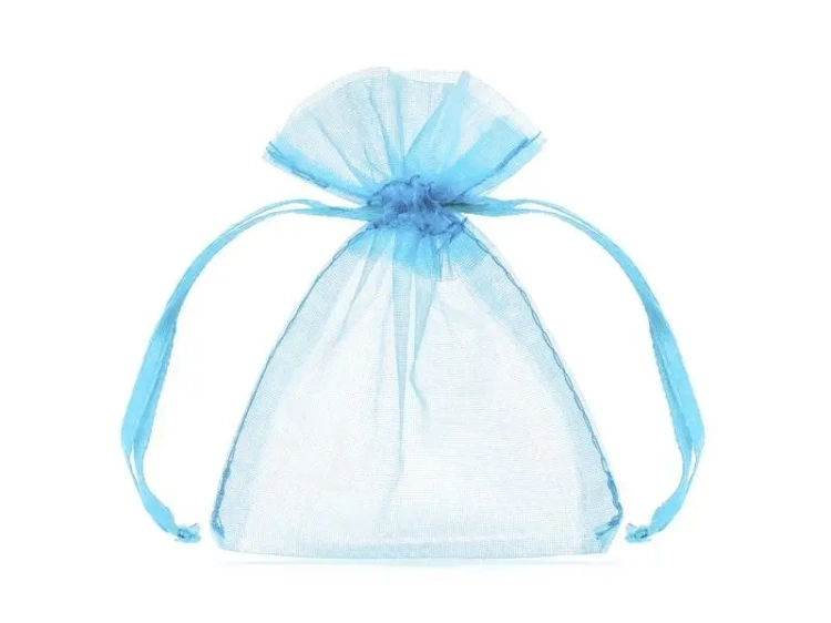 Ściągane woreczki z gładkiej organzy w kolorze błękitnym, wymiary ok. 7.5 x 10 cm. Idealne dla gości weselnych.(1 op. / 10 szt.)