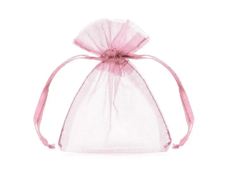 Ściągane woreczki z gładkiej organzy w kolorze różowym, wymiary ok. 7.5 x 10 cm. Idealne dla gości weselnych.(1 op. / 10 szt.)
