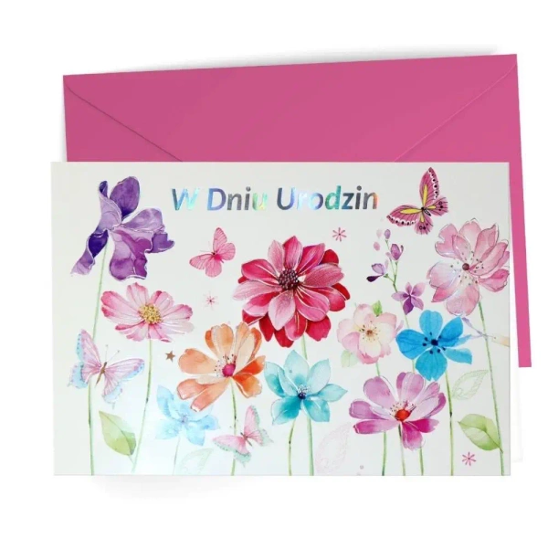 Kartka z kopertą, z życzeniami na urodziny. Opakowana folią open.