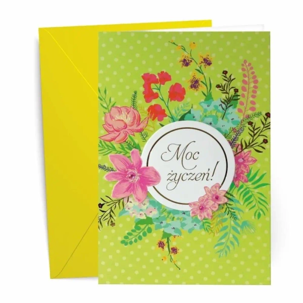 Kartka z kopertą, z życzeniami na różne okazje. Opakowana folią open.