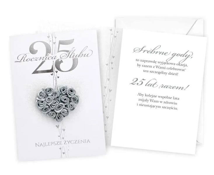 Kartka Dream Cards "25 rocznica ślubu" DK-1235 Kartka B6 z ozdobnej serii Dream Cards na urodziny z wymiennymi cyframi - nieduża, ale robi wrażenie dzięki atrakcyjnej kolorystyce i ciekawym zdobieniom. To idealny wybór łączący przyjazną cenę z jakością. Cechy szczególne: wielkość: B6, 16.6 x 11.7 cm po złożeniu, koperta: w zestawie, kolorowa, zdobienia: kolorowe, różnorodne, bogate (w zależności od wzoru: przyklejane dekoracje, elementy biżuteryjne, odstawniki, metaliczne folie, tłoczenia itp.), okazja: Rocznica ślubu