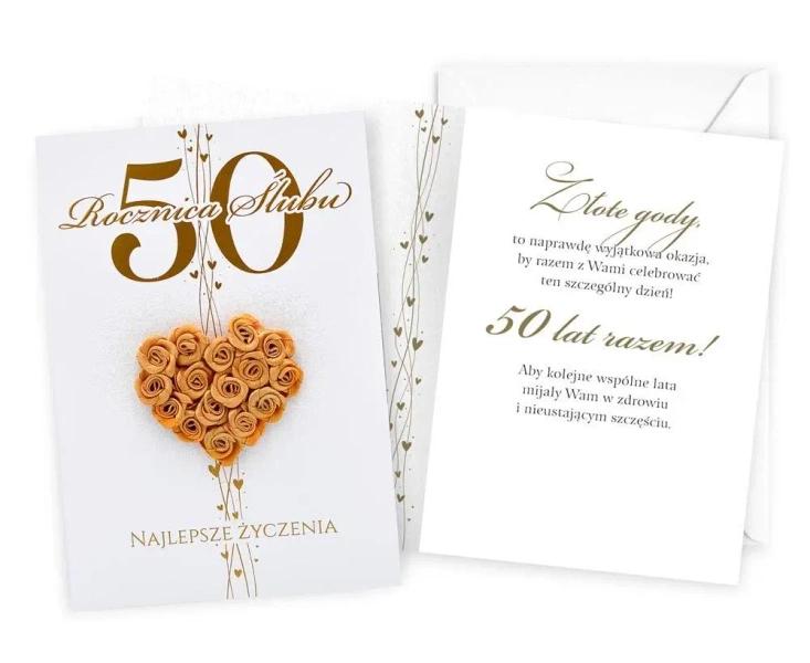Kartka Dream Cards "50 rocznica ślubu" DK-1236 Kartka B6 z ozdobnej serii Dream Cards na urodziny z wymiennymi cyframi - nieduża, ale robi wrażenie dzięki atrakcyjnej kolorystyce i ciekawym zdobieniom. To idealny wybór łączący przyjazną cenę z jakością. Cechy szczególne: wielkość: B6, 16.6 x 11.7 cm po złożeniu, koperta: w zestawie, kolorowa, zdobienia: kolorowe, różnorodne, bogate (w zależności od wzoru: przyklejane dekoracje, elementy biżuteryjne, odstawniki, metaliczne folie, tłoczenia itp.), okazja: Rocznica ślubu