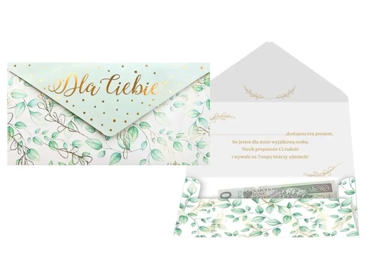 Koperta podarunkowa KOP-003. Koperta podarunkowa jest eleganckim sposobem na podarowanie bliskiej osobie banknotu lub karty podarunkowej. Koperta jest kolorowa i uszlachetniona metalizowaną folią hot-stamp, jest solidnie wykonana i wyposażona w rzep, co umożliwia jej wielokrotne otwieranie i zamykanie. Koperta zawiera życzenia w środku. Specyfikacja: wymiary: 20 x 10,5 cm (po złożeniu) wnętrze: życzenia w środku okazja: BN