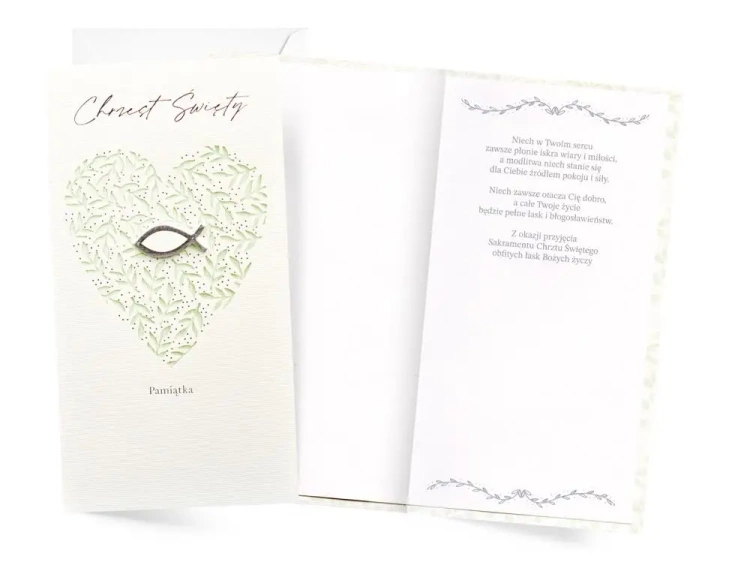 Kartka na Chrzest z serii Passion Moments PM-398 Każda kartka w kolekcji Passion Moments to małe arcydzieło - wyjątkowe i niepowtarzalne, piękne wizualnie. Kartki PM są bardzo bogato zdobione, a jednocześnie skromne i stylowe, cały efekt tkwi w detalach i doskonałym wykonaniu. W zależności od wzoru, na kartkach znajdują się dekoracje ze złotej, srebrnej, perłowej lub holograficznej folii, a także doklejki biżuteryjne, kokardki, laserowe wycięcia, wstążeczki i inne dodatki. Wnętrze karnetu to zawsze atrakcyjna grafika i tekst życzeń. Kartki mają w komplecie dopasowaną kopertę. Cechy szczególne: zdobienie: przynajmniej dwie folie (metaliczne/perłowe/holograficzne), elementy doklejane, wycięcia laserowe, wstążeczki - w zależności od wzoru, wnętrze: z delikatną grafiką, wyjątkowe życzenia w środku, w komplecie: dopasowana kolorystycznie koperta, wymiary karnetu po złożeniu: 11,4 x 21,5 cm. okazja: Chrzest