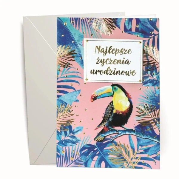 Kartka z kopertą, z życzeniami urodzinowymi. Opakowana folią open.