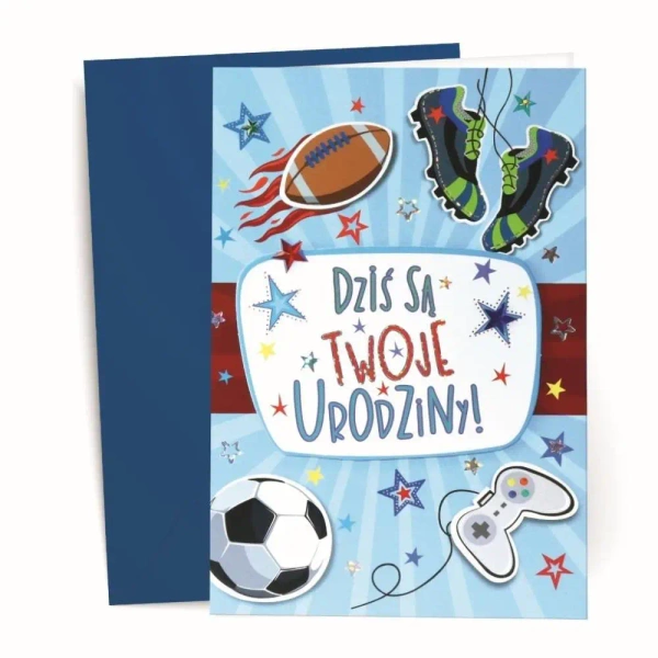 Kartka z kopertą, z życzeniami urodzinowymi. Opakowana folią open.