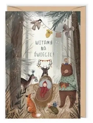 Otwierana kartka, pusta w środku, wykonana na papierze (z certyfikatem EFC) z wyraźnie widoczną fakturą. W zestawie ekologiczna koperta.