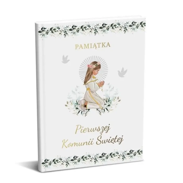 Książeczka z okazji I Komunii Świętej w formacie A5 wraz z kopertą w środku. Wyjątkowa książeczka upamiętniająca jeden z najważniejszych dni w życiu dziecka - Pierwszą Komunię Świętą. Elegancka i starannie wykonana pamiątka w formacie A5, ozdobiona złotymi detalami i delikatnymi ilustracjami nawiązującymi do sakramentu Eucharystii. Format: A5 (poręczny i elegancki), Kolorowe ilustracje w środku, które nadają całości wyjątkowego charakteru, Miejsce na osobiste wpisy - idealna do zachowania wspomnień z uroczystości, Koperta wewnątrz.
