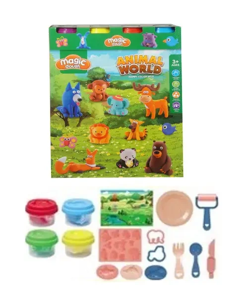 Zestaw kolorowej masy plastycznej (4szt) oraz foremek zwierząt oraz innych akcesoriów potrzebnych do stworzenia zwierzątek np. talerz, wałek, nożyk. Produkt zapakowany w kartonowe opakowanie. Produkt dla dzieci od 3 lat. Podane wymiary są wymiarami opakowania.