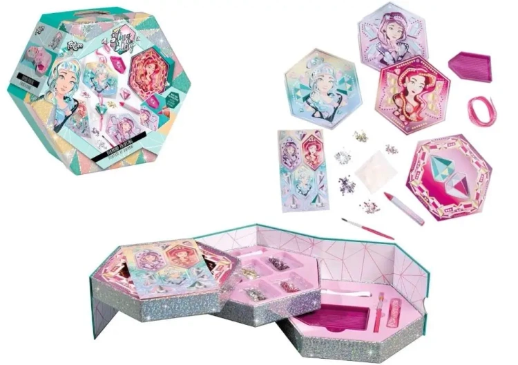 Zestaw kreatywny TOTUM Bling Bling Diamond Painting to wyjątkowa propozycja dla dzieci, które uwielbiają rękodzieło, biżuterię i błyszczące ozdoby. Produkt zawiera wszystkie niezbędne elementy do stworzenia trójwymiarowych obrazków techniką diamentowej mozaiki. Każda z sześciokątnych plansz przedstawia unikalne ilustracje w stylu glamour, które po udekorowaniu mieniącymi się kryształkami stają się gotowymi dekoracjami do zawieszenia. Wszystkie elementy są starannie zapakowane w dużą rozkładaną szkatułkę, która pełni funkcję zarówno opakowania, jak i organizera do pracy twórczej.