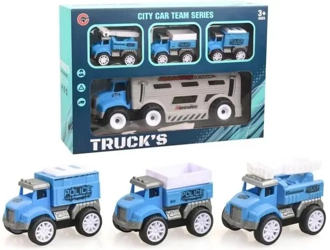 Hercules City Car Team Series - Zestaw Policyjnych Ciężarówek (4 sztuki) Wprowadź swoje dziecko w fascynujący świat służb miejskich z zestawem Hercules City Car Team Series! Ten ekscytujący komplet zawiera aż cztery policyjne pojazdy, które zapewnią długie godziny kreatywnej zabawy. W pudełku znajdziesz solidną, dużą ciężarówkę transportową , idealną do przewożenia mniejszych pojazdów na miejsce akcji. Oprócz dużej ciężarówki, w zestawie znajdują się trzy mniejsze, dynamiczne radiowozy policyjne w charakterystycznym niebieskim kolorze z napisem "POLICE". Każdy z mniejszych pojazdów posiada unikalne cechy: jeden wyposażony jest w otwartą skrzynię ładunkową, drugi posiada zabudowaną skrzynię z białym dachem, a trzeci ma na dachu dodatkowe elementy przypominające sprzęt specjalistyczny. Zestaw Hercules City Car Team Series to doskonały sposób na rozwijanie wyobraźni i zdolności manualnych dziecka. Maluchy mogą odgrywać różnorodne scenariusze policyjnych akcji, organizować pościgi i dbać o bezpieczeństwo swojego miasta. Wytrzymała konstrukcja i dbałość o detale gwarantują długotrwałą zabawę. Produkt przeznaczony jest dla dzieci powyżej 3 roku życia. Zapakowany w estetyczne pudełko, idealnie nadaje się na prezent. Niech Twoje dziecko dołączy do zespołu Hercules City Car Team i poczuje się jak prawdziwy bohater!