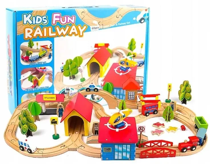 Drewniany tor kolejka Autka, helikopter, drzewa... - Leantoys