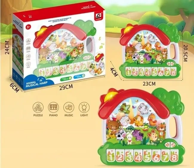 Interaktywna Muzyczna Zabawka "Wesoła Farma" - Edukacyjna Przygoda Pełna Dźwięków i Świateł. Zapraszamy do fascynującego świata "Wesołej Farmy" - interaktywnej zabawki muzycznej, która przeniesie Twoje dziecko w radosną atmosferę wiejskiego podwórka. Ta wielofunkcyjna zabawka łączy w sobie elementy edukacyjne i rozrywkowe, stymulując rozwój sensoryczny i poznawczy malucha. Zabawka ma kształt uroczej farmy z czerwonym dachem i zielonymi drzewkami, przyciągając wzrok żywymi kolorami i sympatycznymi postaciami zwierząt. Na przedniej ściance znajdują się wyjmowane puzzle przedstawiające różne zwierzęta gospodarskie: krowę, kurczaka, owcę i inne. Dopasowywanie puzzli nie tylko ćwiczy motorykę małą i koordynację wzrokowo-ruchową, ale także uczy rozpoznawania kształtów i nazw zwierząt. Kolorowe pianinko z ośmioma klawiszami oznaczonymi cyframi od 1 do 8 oraz symbolami nut. Dziecko może swobodnie naciskać klawisze, tworząc własne proste melodie i eksperymentując z dźwiękami. Dodatkowo, zabawka oferuje gotowe wesołe melodie, które umilą czas zabawy i rozwiną słuch muzyczny. "Wesoła Farma" wyposażona jest również w efekty świetlne. Podczas odtwarzania melodii lub naciskania niektórych przycisków, zabawka emituje delikatne, migoczące światełka, które dodatkowo angażują zmysł wzroku dziecka i czynią zabawę jeszcze bardziej atrakcyjną. Ta interaktywna zabawka to doskonały sposób na wprowadzenie dziecka w świat dźwięków, muzyki i zwierząt. Stymuluje ciekawość, rozwija wyobraźnię i zachęca do interakcji. Wykonana z bezpiecznych i trwałych materiałów, jest idealnym prezentem dla dzieci w wieku od 3 lat. Główne cechy zabawki: Przyciski ze zwierzętami. Pianinko: Osiem kolorowych klawiszy do tworzenia własnych melodii. Gotowe melodie: Wesołe piosenki do słuchania i naśladowania. Efekty świetlne: Migoczące światełka uatrakcyjniające zabawę. Edukacyjna wartość: Rozwija motorykę małą, koordynację wzrokowo-ruchową, słuch muzyczny i ciekawość świata. Bezpieczne materiały: Wykonana z wysokiej jakości, nietoksycznych materiałów. Zasilanie: Baterie (brak w zestawie). Wymiary zabawki: 23 cm (szerokość) x 20.5 cm (wysokość) x 4 cm (głębokość). Wymiary opakowania: 29 cm x 24 cm x 6 cm. Podaruj swojemu dziecku "Wesołą Farmę" i obserwuj, jak odkrywa fascynujący świat dźwięków i zabawy!
