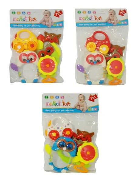 Zestaw 5 grzechotek/gryzaczków dla niemowląt. Produkty mają różne kształty i kolory (np. sowy, lisa, kwiatka i auta) przez co będa oddziaływać u dzieci na zmysł wzroku i dotyku. Produkt występuje w kilku wersjach kolorystycznych, wybierany losowo. Cena dotyczy jednej sztuki. Produkt zapakowany w przezroczysty worek. Zabawka dla dzieci od 3 miesiąca życia.