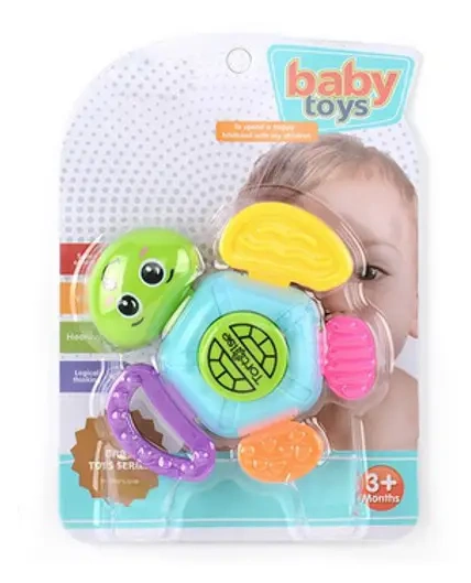 Kolorowa grzechotka - gryzaczek w kształcie żółwia. Wewnątrz w zabawce znajdują się kuleczki które wydają dźwięki. Oddziałuje ona na zmysł wzroku, dotyku i słuchu. Produkt przeznaczony dla dzieci od 3 miesiąca życia. Podane wymiary są wymiarami opakowania. Zabawka zapakowana w kartonową podstawkę z przezroczystym kloszem.