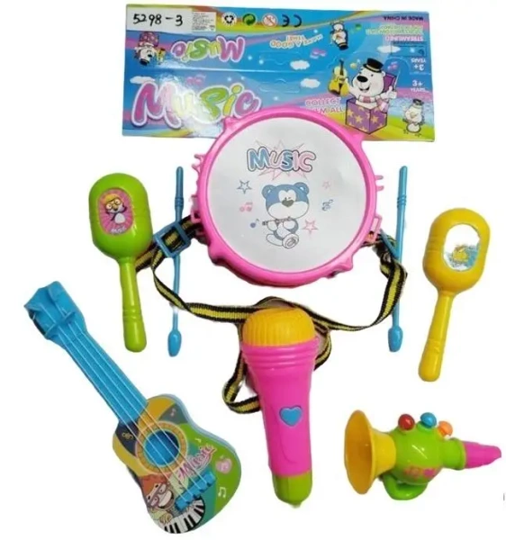 Odkryj wspaniały świat muzyki z naszym kolorowym zestawem instrumentów dla dzieci! Ten fantastyczny komplet zapewni Twojemu maluchowi wiele godzin kreatywnej zabawy, rozwijając jego słuch muzyczny, poczucie rytmu i koordynację ruchową. W skład zestawu wchodzą: Bębenek: Uroczy, różowy bębenek z pałeczkami i paskiem do zawieszenia, idealny do wybijania pierwszych rytmów. Mikrofon: Jasnoróżowy mikrofon z serduszkiem, dzięki któremu Twoja pociecha poczuje się jak prawdziwa gwiazda estrady. Gitara: Mała, niebieska gitara z kolorowymi elementami, zachęcająca do pierwszych prób grania. Trąbka: Zabawna, zielono-żółta trąbka z kolorowymi przyciskami, która wyda radosne dźwięki. Marakasy (2 sztuki): Dwie kolorowe marakasy (zielona i żółta) o przyjemnym brzmieniu, doskonałe do potrząsania i tworzenia własnych melodii. Wykonane z bezpiecznych i trwałych materiałów, instrumenty są idealne dla małych rączek. Żywe kolory i przyjazny design z pewnością przyciągną uwagę każdego dziecka. Zestaw zapakowany jest w kolorowe pudełko, dzięki czemu świetnie sprawdzi się jako prezent na urodziny, Dzień Dziecka lub inną okazję. Rozbudź muzyczną wyobraźnię swojego dziecka już dziś!