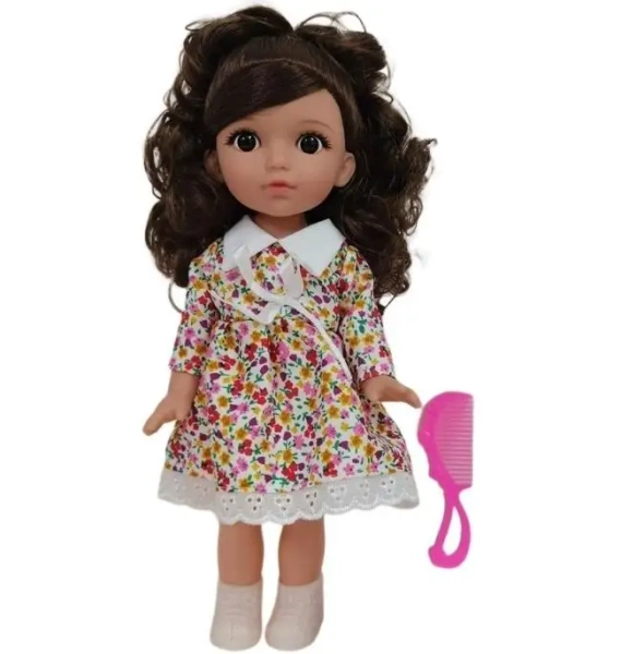 Przedstawiamy uroczą lalkę, która zachwyci każde dziecko! Ubrana w śliczną sukienkę w kolorowe kwiaty z eleganckim, białym kołnierzykiem i koronkowym wykończeniem, lalka prezentuje się niezwykle stylowo. Jej długie, kręcone, brązowe włosy idealnie nadają się do czesania i stylizacji, a dołączony różowy grzebień ułatwi tę zabawę. Lalka ma sympatyczną buzię i duże, brązowe oczy, które dodają jej uroku. Wykonana z bezpiecznych i trwałych materiałów, będzie wspaniałym towarzyszem zabaw na długie godziny, rozwijając wyobraźnię i zdolności manualne dziecka. Idealny pomysł na prezent!