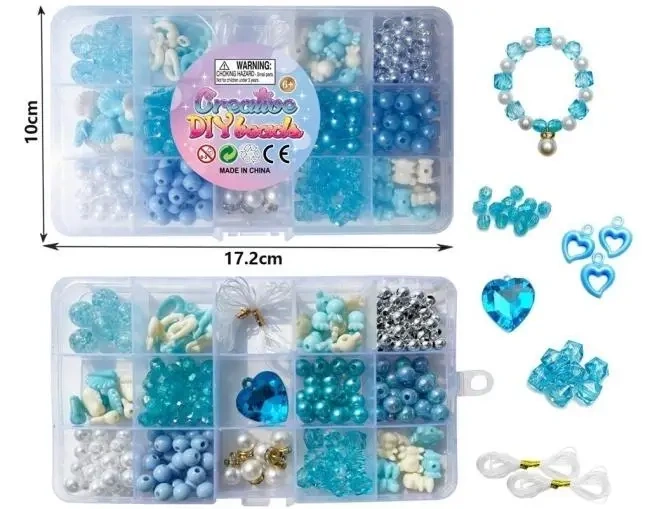 Odkryj świat kreatywności z naszym uroczym zestawem niebieskich akrylowych koralików! Ten komplet zawiera różnorodne style. Bogata paleta odcieni błękitu pozwoli Ci projektować subtelne i efektowne ozdoby DIY, takie jak bransoletki, naszyjniki, kolczyki czy dekoracje do włosów. Koraliki wykonane są z lekkiego i trwałego akrylu. Całość zapakowana jest w praktyczny organizer z przegródkami, co ułatwia utrzymanie porządku i szybki wybór potrzebnych elementów. Ten zestaw to doskonała propozycja dla każdego, kto lubi tworzyć własnoręcznie biżuterię i inne ozdoby. To również wspaniały pomysł na prezent dla osób z kreatywną duszą. Niech Twoja wyobraźnia rozkwitnie!