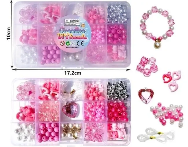Odkryj radość tworzenia własnej, niepowtarzalnej biżuterii z naszym uroczym zestawem Creative DIY Beads w odcieniach różu! Ten bogaty komplet zawiera aż 15 przegródek wypełnionych różnorodnymi koralikami w różnych kształtach, rozmiarach i fakturach - od klasycznych okrągłych perełek, przez urocze kwiatki, aż po błyszczące elementy. Dzięki takiemu wyborowi możliwości projektowania są niemal nieograniczone. Zestaw idealnie nadaje się do tworzenia spersonalizowanych bransoletek przyjaźni, efektownych naszyjników, ozdobnych pierścionków czy oryginalnych breloczków. To doskonały sposób na rozwijanie kreatywności, zdolności manualnych oraz wyobraźni zarówno u dzieci, jak i dorosłych. Stworzona własnoręcznie biżuteria będzie wyjątkowym prezentem dla bliskiej osoby lub unikalnym dodatkiem do Twojej stylizacji. Praktyczne pudełko z 15 przegródkami ułatwia organizację koralików i utrzymanie porządku podczas pracy. Wymiary pudełka czynią je kompaktowym i łatwym do przechowywania. Zestaw zawiera różnorodne różowe i białe koraliki, a także dodatkowe elementy ozdobne, jak zawieszki w kształcie serc i gotową bransoletkę jako inspirację. Podaruj sobie lub bliskiej osobie ten inspirujący zestaw i pozwól rozkwitnąć kreatywności!
