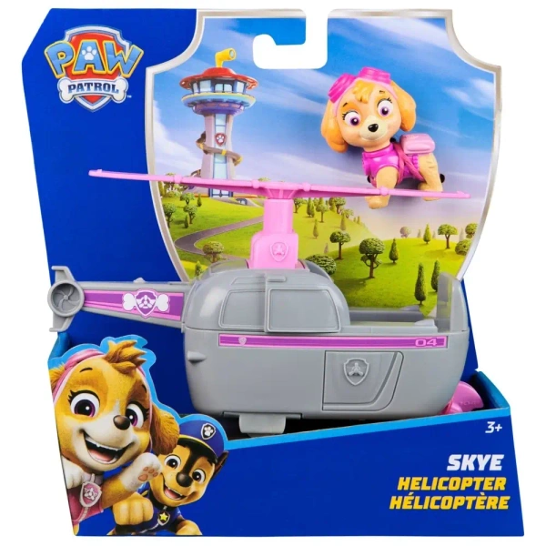 Helikopter z figurką Skye wyrusza w ekscytującą misję ratowniczą! A ty razem z nim! Posadź szczeniaczka w kokpicie, obracaj śmigłami i wznieś się, by patrolować okolicę. Możesz też sunąć po podłodze, dzięki obracającym się kołom. Piesek ma na sobie charakterystyczny, różowy kombinezon lotniczy.