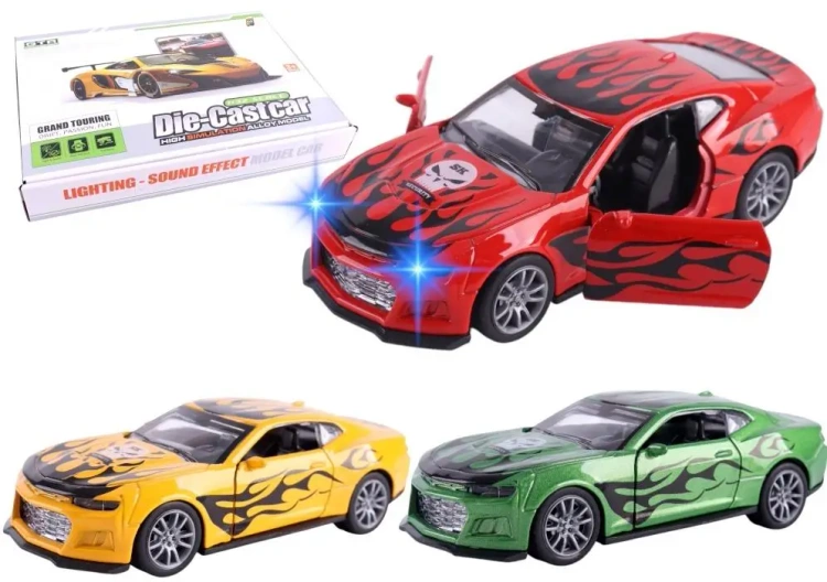 Metalowy samochód sportowy w skali 1:32 to dynamiczny model inspirowany muscle carami, który łączy realistyczne detale z efektami świetlnymi i dźwiękowymi. Jego metalowa konstrukcja zapewnia trwałość, a precyzyjnie odwzorowane wnętrze i agresywne malowanie z płomieniami dodają mu charakteru. Model wyposażony jest w funkcję pull-back, otwierane drzwi oraz światła LED, które rozświetlają reflektory podczas jazdy.