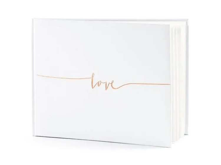 Księga Gości oprawiona papierem w kolorze białym, z napisem Love w kolorze różowego złota, wymiary ok. 24 x 18,5 cm, 22 kartki, bez tekstu.