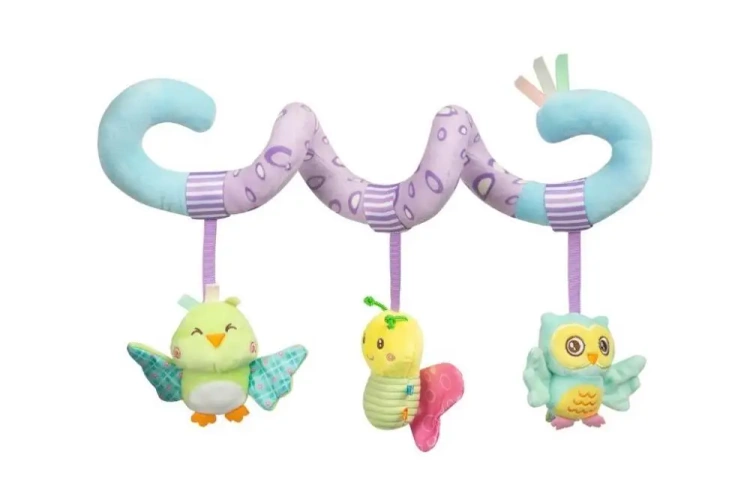 Sprężynka została wyposażona w zwisające zabawki sensoryczne, takie jak grzechotki i gryzaki, które rozwijają zmysły malucha. Różnorodne faktury materiałów stymulują dotyk, a żywe barwy przyciągają uwagę dziecka, wspierając jego rozwój wzrokowy i motoryczny.