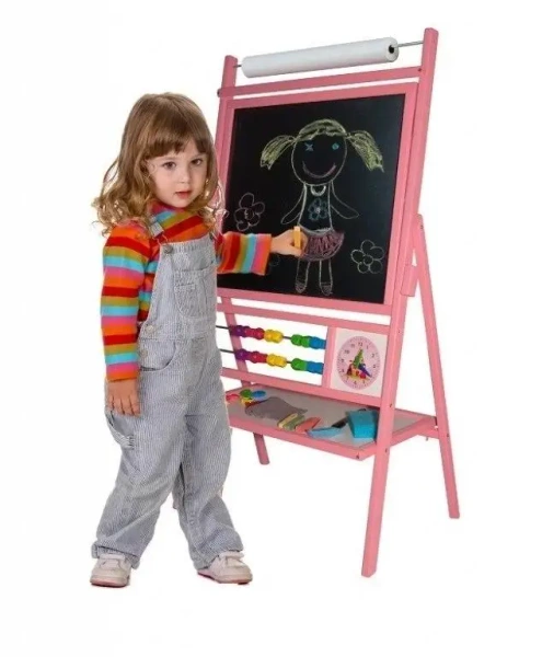 Obrotowa, Różowa, suchościeralno-kredowo-magnetyczna tablica z 2-rzędowym liczydłem i ROLKĄ papieru do rysowania, zegar z motywem księżniczki z ruchomymi wskazówkami. Wyposażona w gąbkę i kredę. Marker w zestawie.