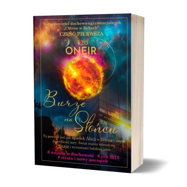 BURZE NA SŁOŃCU to szamańska powieść osadzona w realiach współczesnego świata korporacyjnego. Główna bohaterka, Ewa, jest typową przedstawicielką współczesnych bizneswomen - pracuje w dużej korporacji, gdzie jej obowiązki często przekraczają standardowy wymiar czasu pracy. Choć na pozór jej życie jest spełnieniem marzeń wielu osób, Ewa odczuwa głębokie wewnętrzne rozdarcie, czując, że to, co robi, nie jest jej prawdziwym powołaniem. Ewa jest symbolem naszych czasów - osób, które w codziennym pędzie próbują odnaleźć spokój i sens. Jej historia jest uniwersalnym odzwierciedleniem poszukiwań wielu z nas, którzy w zgiełku życia zawodowego pragną znaleźć chwilę wytchnienia i duchowego zrozumienia. SERIA CHIRON W RYBACH: 4 części powieści duchowo-egzystencjalnych (Burze na Słońcu, Imperium Lilith, Kroniki Multiversum, Memento Vitae) Chiron w Rybach symbolizuje podróż przez najgłębsze zakamarki duszy, gdzie przeszłe rany splatają się z tęsknotą za uzdrowieniem. Podobnie jak Chiron w znaku Ryb symbolizuje uzdrowienie poprzez zrozumienie i akceptację, bohaterowie tej serii stawiają czoła swoim słabościom, znajdując siłę w duchowym przebudzeniu. W świecie pełnym chaosu i złudzeń odkrywają, że czasami to, co jest największym wyzwaniem, okazuje się też kluczem do ponownego odkrycia siebie. Powieści Ezo Oneir zawierają surrealistyczne odniesienia, dualizm ducha i świata, nieskończoną przestrzeń wariantów, śmierć ego i opis ludzkiej samotności Powieści poruszają kwestie ludzkich wyborów, wyłamywania się ze schematów społecznych, doświadczania rzeczywistości i przemyśleń nad losem człowieka. Światy przenikają się i tworzą surrealistyczną mieszankę myśli, wizji i przeżyć duchowych. Bohaterowie są zwykle zagubieni i poszukujący swojej drogi. Ukazują naszą rzeczywistość jako jeden z wielu przenikających się wariantów.