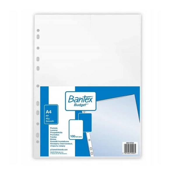 Krystaliczne koszulki Budget w formacie A4, otwierane od góry. Przezroczysta, polipropylenowa folia jest antystatyczna i antyrefleksyjna, co ułatwia przechowywanie koszulek oraz zapewnia doskonałą czytelność dokumentów. 100 SZT. koszulek zapakowanych w folię, dzięki czemu zajmują niewiele miejsca.