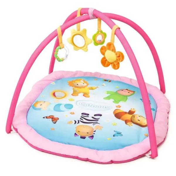 Wspaniała alternatywa na odpoczynek i zabawę maluszka. Mata jest miękka i w pełni bezpieczna, co gwarantuje wygodne użytkowanie. Niewątpliwą zaletą maty jest przestrzeń na swobodne ruchy dziecka oraz skupiające jego uwagę i rozwijające zdolności motoryczne zabaweczki. Nad matą, na pałąkach wiszą 4 akcesoria: lusterko, dwie grzechotki, szeleszczący kwiatek.