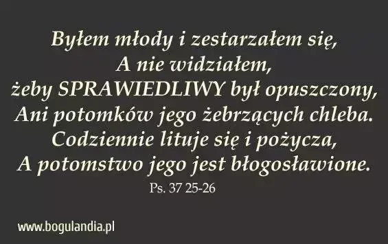 żeby sprawiedliwy był opuszczony, ani potomków jego żebrzących chleba. Codziennie lituje się i pożycza, a potomstwo jego jest błogosławione.