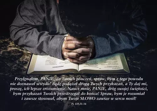 Tekst na kartce: Przylgnąłem, Panie, do Twoich pouczeń, spraw, bym z tego powodu nie doznał wstydu! Będę podążał drogą Twych przykazań, a Ty daj mi, proszę, ich lepsze zrozumienie. Naucz mnie, Panie, dróg swojej świętości, bym przykazań Twoich przestrzegał do końca! Spraw, bym je rozumiał i zawsze stosował, abym Twoje Słowo zawsze w sercu nosił! (Ps 119,31-34)