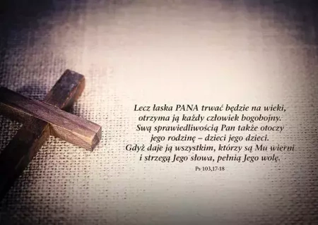 Tekst na kartce: Lecz łaska Pana trwać będzie na wieki, otrzyma ją każdy człowiek bogobojny. Swą sprawiedliwością Pan także otoczy jego rodzinę – dzieci jego dzieci. Gdyż daje ją wszystkim, którzy są Mu wierni i strzegą Jego słowa, pełnią Jego wolę. (Ps 103,17-18)