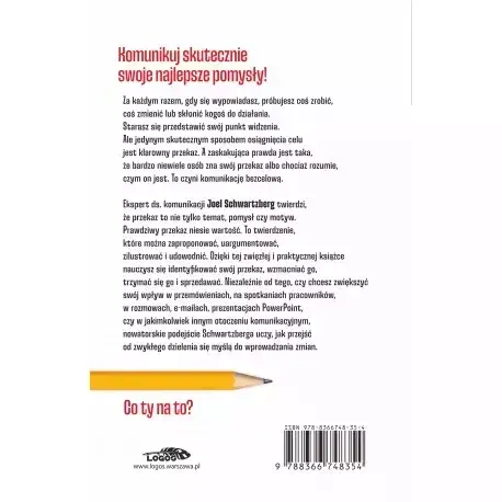 Joel Schwartzberg twierdzi, że przekaz to nie tylko temat, pomysł czy motyw. Prawdziwy przekaz niesie wartość. To twierdzenie, które można zaproponować, uargumentować, zilustrować i udowodnić. Dzięki tej zwięzłej i praktycznej książce nauczysz się identyfikować swój przekaz, wzmacniać go, trzymać się go i sprzedawać. Niezależnie od tego, czy chcesz zwiększyć swój wpływ w przemówieniach, na spotkaniach pracowników, w rozmowach, e-mailach, prezentacjach PowerPoint, czy w jakimkolwiek innym otoczeniu komunikacyjnym, nowatorskie podejście Schwartzberga uczy, jak przejść od zwykłego dzielenia się myślą do wprowadzania zmian.