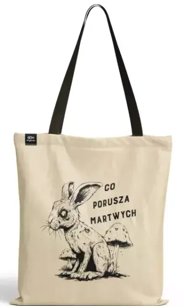 Torba inspirowana książką Co porusza martwych i jej mroczną atmosferą, przywołującą niepokojące, pełne tajemnic historie. Ilustracja przedstawia królika, będącego w tej fantastycznej opowieści swego rodzaju omenem, wśród grzybów, które... odgrywają tam kluczową rolę. Ten intrygujący motyw nadaje torbie wyjątkowy charakter. Bądźcie ostrożni w lesie i nie zapomnijcie patrzeć wstecz!