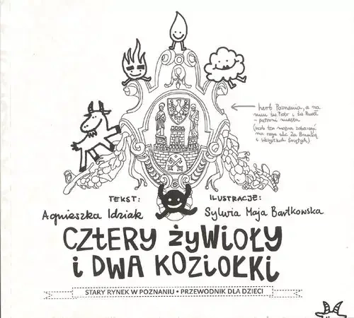Książka Cztery żywioły i dwa koziołki to interaktywny przewodnik dla młodych i nawet trochę starszych odkrywców Poznania i Starego Rynku. By wyruszyć w historyczną podróż, wystarczy wybrać jeden z czterech żywiołów – WODĘ, OGIEŃ, POWIETRZE lub ZIEMIĘ – i udać się wyznaczonym przez nie szlakiem. Opatrzone symbolem żywiołu trasy zostały opisane w książce i narysowane na dołączonej do niej mapce.