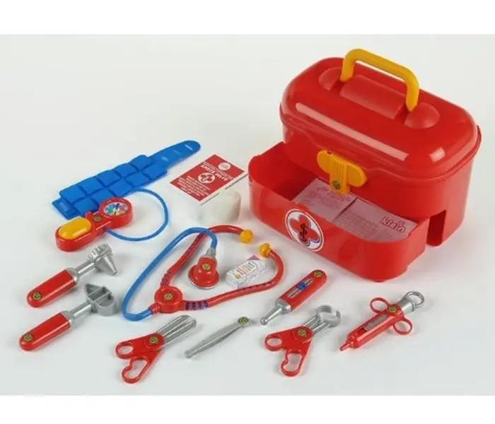 Zestaw lekarski w kuferku z szufladą jest jednym z najbogatszych w serii. Zawiera on kompletne, niezbędne wyposażenie każdego medyka. Czerwony kuferek wykonany jest z bardzo trwałego tworzywa, posiada wygodny uchwyt do noszenia oraz żółty klips, który zabezpiecza ją przed otwieraniem się. Kuferek jest dwukomorowy, a cały zestaw zawiera aż 14 elementów. Oprócz standardowych przyrządów jak stetoskop, otoskop, termometr czy strzykawka, zawiera także ciśnieniomierz nadgarstkowy z dźwiękiem. Wszystkie elementy są oczywiście bezpieczne dla dzieci i proste w użyciu. Dzięki dużej pojemności i dostępności dwóch komór kuferka, dziecko może wzbogacić swój zestaw o np. bandaże, kompresy czy inny ekwipunek, który uzna za niezbędny. Standardowo kuferek zawiera plastikowy stetoskop, zabawkowy ciśnieniomierz z dźwiękiem (wymaga użycia baterii, których brak w zestawie), strzykawkę, termometr, otoskop, młoteczek, nożyczki, szczypce, plaster, pensetę, pudełeczko na watę, kartę pomiarów medycznych. Wszystkie elementy są oczywiście bezpieczne dla dzieci i proste w użyciu. Seria zestawów i akcesoriów lekarskich z jednej strony służy zabawie w doktora czy pielęgniarkę, a z drugiej strony pomaga dzieciom oswoić się z tematem wizyty u lekarza, wykonywanych badań i zabiegów. Mamy tutaj szeroki wybór zestawów z większą lub mniejszą ilością akcesoriów oraz szereg pojedynczych produktów jak np. fartuchy lekarskie czy stetoskopy. Cała seria wizualnie stworzona jest tak, aby mogli się nią bawić zarówno chłopcy jak i dziewczynki.