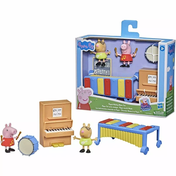 Świnka Peppa i Pedro Pony to kumple z grupy, którzy uwielbiają grać razem! Dzięki zestawowi dzieci mogą udawać, że śpiewają i grają piosenki. Ta zabawka, inspirowana uznanym serialem animowanym Entertainment One UK, zawiera 3-calowe figurki Świnki Peppy i Pedro Pony. Przedszkolaki mogą udawać, że Peppa i Pedro grają na perkusji, pianinie lub ksylofonie! Dzieci w wieku 3 lat i starsze mogą odgrywać sceny z bajki lub tworzyć własne historie. Zestaw to również świetny pomysł na świąteczny lub urodzinowy prezent.