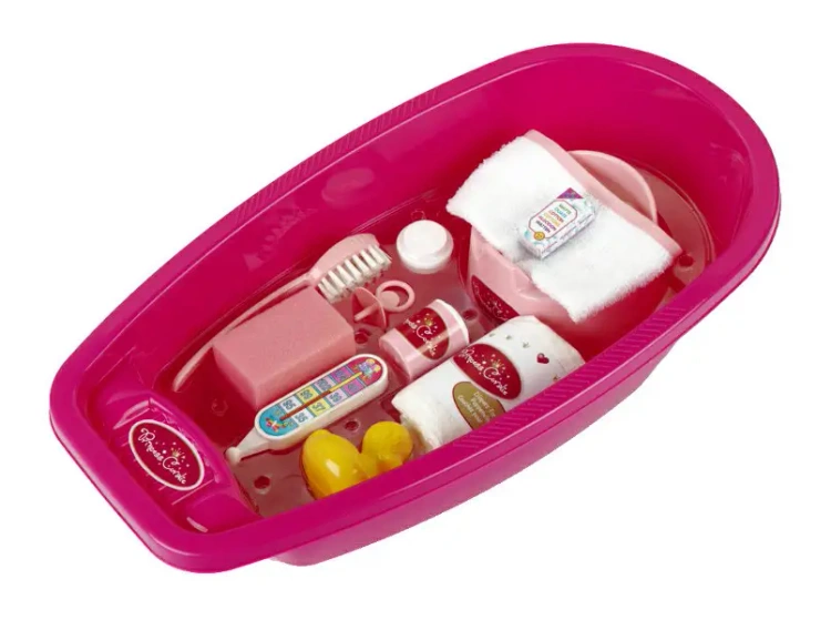 Składa się z wanienki, gąbki, myjki, śliniaczka, nocnika, pieluchy, smoczka, rybki, rozgwiazdy, termometru, grzebienia, buteleczki zasypki i kremu dla niemowląt Waga : 0,7 kg Wymiary opakowania : 51x28x15 cm Ilość w opakowaniu zbiorczym : 6 Kraj pochodzenia : Niemcy Duży zestaw do kąpieli jest częścią serii Baby Coralie firmy Klein, która opracowała wiele pięknych akcesoriów dla lalek: śpiworki, nosidełka dla lalek, krzesełka, w pełni wyposażone torby na pieluchy, wanienki i zestawy pielęgnacyjne i wiele więcej. Kiedy dzieci opiekują się swoimi lalkami, zabierają je ze sobą, gdziekolwiek się udają, pielęgnują je i troszczą się o nie, rozwijają empatię, wyobraźnię i zdolności motoryczne. Wszystkie zabawki tej serii przyczyniają się do pomysłowego odgrywania ról, podczas którego dzieci uczą się wiele o odpowiedzialności, miłości, trosce, komunikacji i empatii.