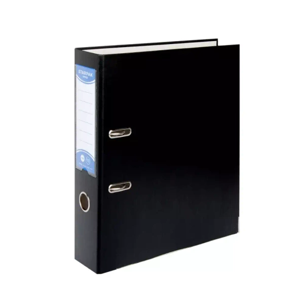 Wykonany z twardej 2 mm tektury. Pokryty z zewnątrz folią PP. Wewnątrz wyklejka papierowa. Mechanizm dźwigniowy z dociskiem .Grzbiet o szerokości 75 mm .Oczko grzbietowe .Okucia owalne na przedniej okładce .Dolne krawędzie wzmocnione metalową listwą.