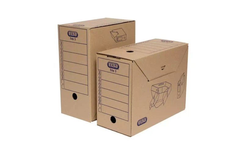 Wykonane z twardej tektury falistej. Do przechowywania dokumentów A4 wypiętych z dwóch segregatorów 80 mm. Możliwość ustawiania poziomo lub pionowo. Miejsce do opisu zawartości. Na grzbiecie otwory ułatwiające wyjmowanie i przenoszenie kartonów. Szerokość grzbietu: 15,5 cm.