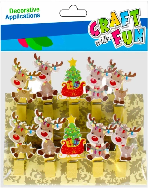 Klamery w kształcie reniferów i sań z zestawu CRAFT with FUN to doskonała ozdoba do twoich świątecznych dzieł. Zestaw zawiera 10 klamerek, z czego 8 przedstawia urocze renifery, a 2 to klasyczne sanie.