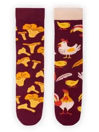 Asymetryczne skarpety w kurki (grzyby i kury)